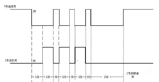 自動方式控制方式:是通過對進煙閥和反吸閥設定開啟時間來控制其開關狀態(tài)。以現場1號除塵室為例,給出進煙閥和反吸閥開啟時序圖: