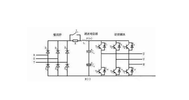 缺相故障是變頻器常見故障中的一種,要知道單相220V與三相380V是變頻器產(chǎn)品主要的分別,當(dāng)然輸入缺相檢測只存在于三相的產(chǎn)品中。圖1所示為變頻器主電路,R、S、T為三相交流輸入,當(dāng)其中的一相因為熔斷器或斷路器的故障而斷開時,便認(rèn)為是發(fā)生了輸入缺相故障。