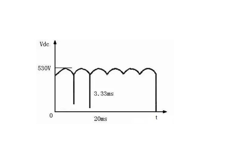 由此可以看出,在變頻器輸入缺相后仍在運行時,電容C將被反復(fù)大范圍的充電,這種情況是不允許的,它必然將使電容器損壞,從而造成整臺變頻器的損壞。并且,若負(fù)載較輕,雖然不會造成電容的損壞,但是直流電壓的紋波系數(shù)相比于正常時將會增大很多,而且目前變頻器一般具有恒電壓控制功能,這將造成開關(guān)占空比的振蕩和負(fù)載電流的振蕩。而負(fù)載較重時,則進(jìn)一步損壞整流橋,促使變頻器故障幾率增大,如在送電時就發(fā)生缺相,由于單相大電流運行極易造成變頻器燒毀。