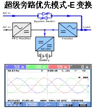 超級(jí)旁路優(yōu)先運(yùn)行模式(E變換模式)。正常情況下,逆變器與旁路市電并聯(lián)工作,相當(dāng)于有源濾波器,逆變器提供諧波電流和無(wú)功功率,旁路市電回路提供基波電流和有功功率。輸出電壓由旁路決定。