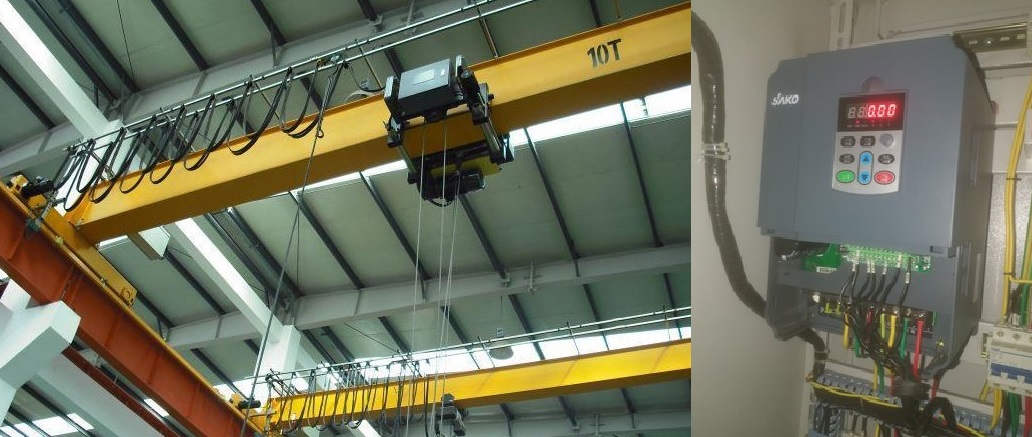 當(dāng)我們需要的對(duì)兩臺(tái)或兩臺(tái)以上生產(chǎn)機(jī)械的電機(jī)進(jìn)行同時(shí)拖動(dòng)時(shí),這里我們以橋式起重機(jī)為例,該設(shè)備是由安裝在兩側(cè)相同功率的電機(jī)進(jìn)行同時(shí)拖動(dòng)。這里的兩臺(tái)電機(jī)是通過同一臺(tái)起重機(jī)變頻器進(jìn)行供能與控制的,協(xié)調(diào)兩臺(tái)電機(jī)進(jìn)行升降調(diào)速的功能。這種情況不但要求兩臺(tái)電機(jī)的轉(zhuǎn)速同步,而且要求它們的負(fù)荷分配盡量均衡。而杭州三科生產(chǎn)SKI600系列產(chǎn)品所具備的下垂功能,可以很好地滿足起重設(shè)備這種應(yīng)用需求。