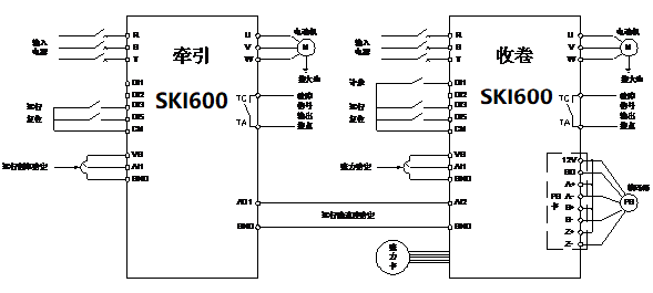 吹膜機主要由吹膜和收卷兩部分組成,是一種將塑料粒子加熱融化并吹成薄膜的設備。其中收卷部分的作用是將吹制出的薄膜卷取成卷,并使成卷的薄膜平整無皺紋,卷邊整齊,卷軸上的薄膜要松緊適中,以防止薄膜拉伸變形,保證質量,因此收卷時必須采用恒張力控制。目前行業(yè)內主要使用力矩電機來實現上述控制,但在使用過程中存在著需手動調節(jié),操作不方便,長時間運行時力矩電機發(fā)熱較高,其控制器較易損壞,可靠性不高的缺點。本文擬結合三科SKI600變頻器,介紹一種針對吹膜機收卷的恒張力控制系統,在保證收卷工藝的同時可顯著提高設備的操作簡易性和可靠性。