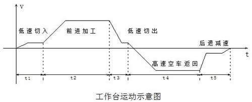 t5段為緩沖區(qū)。返回行程行將完畢,再反向到工作速度之前,為減小對傳動機械的沖擊,應將速度降低,之后進入下一周期。頻率:10Hz。
