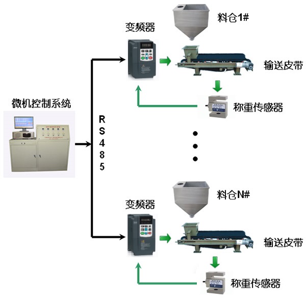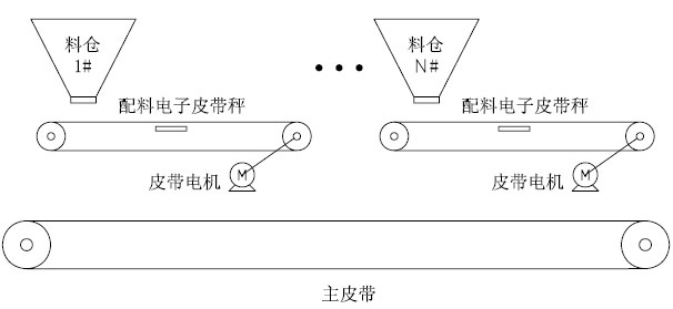 其主要工作流程是:料倉打開后,物料落入相應(yīng)的皮帶上,皮帶電機(jī)拖動皮帶轉(zhuǎn)動,則物料被連續(xù)拉出,皮帶電機(jī)的轉(zhuǎn)速就決定了物料的流量。每個(gè)皮帶下面有一自動稱重皮帶秤,通過皮帶秤就可以稱出下料的流量、累積量等數(shù)據(jù)。所有皮帶的下面是一輸送主皮帶,主要作用是把混合好的原料送到下級容器中。
