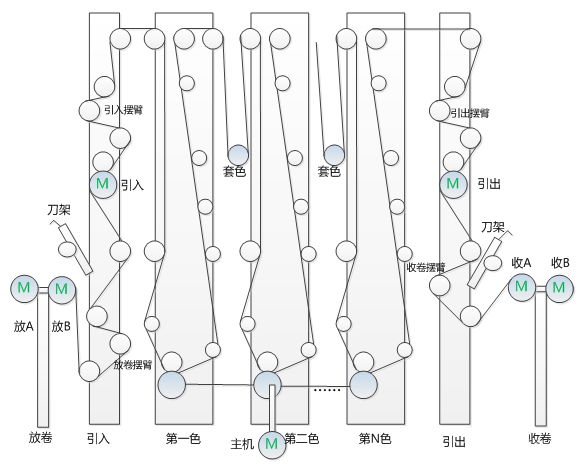 七電機張力控制系統(tǒng)是當(dāng)前凹版印刷行業(yè)中較為普遍的應(yīng)用案例,整個系統(tǒng)由七個變頻驅(qū)動電機控制,分別由兩個放卷、兩個收卷、一個主機和一個收卷放卷牽引組成。其中收卷、放卷、放卷牽引均為帶張力反饋的閉環(huán)張力控制,變頻器以調(diào)速方式運行。另外,由于二級牽引中間是打印單元,對套色精度有較高的要求,因此張力調(diào)節(jié)的穩(wěn)定性非常重要,因此主機和二級牽引均采用帶編碼器的閉環(huán)矢量控制。其它拉力控制系統(tǒng)都是在七電機拉力控制系統(tǒng)的基礎(chǔ)上增加或減少電機組成。