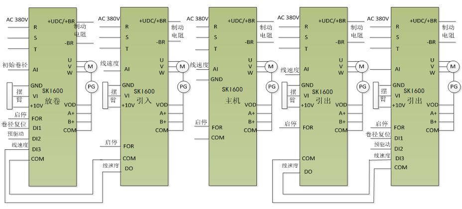 PLC只完成不同版輥同步頻率的簡單匹配(主速處理),邏輯控制,大量張力控制和操作由變頻器自動完成;安裝調(diào)試簡單易行;
