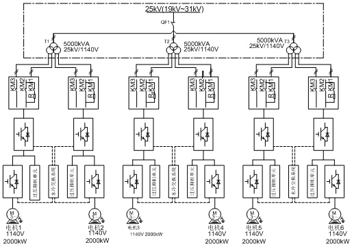 機車有牽引模式和制動模式,當機車測時牽引模式時,機車牽引電機帶動試驗臺電機,機車電動模式,試驗臺處于發(fā)電模式,試驗臺向機車加載,機車試驗臺中的1號變流器力矩模式運行,其他5臺從機力矩跟隨。保證6軸出力相同。當機車測時制動模式時,試驗臺中1號變流器運行速度模式,其他5臺從機力矩跟隨。保證6軸出力相同。