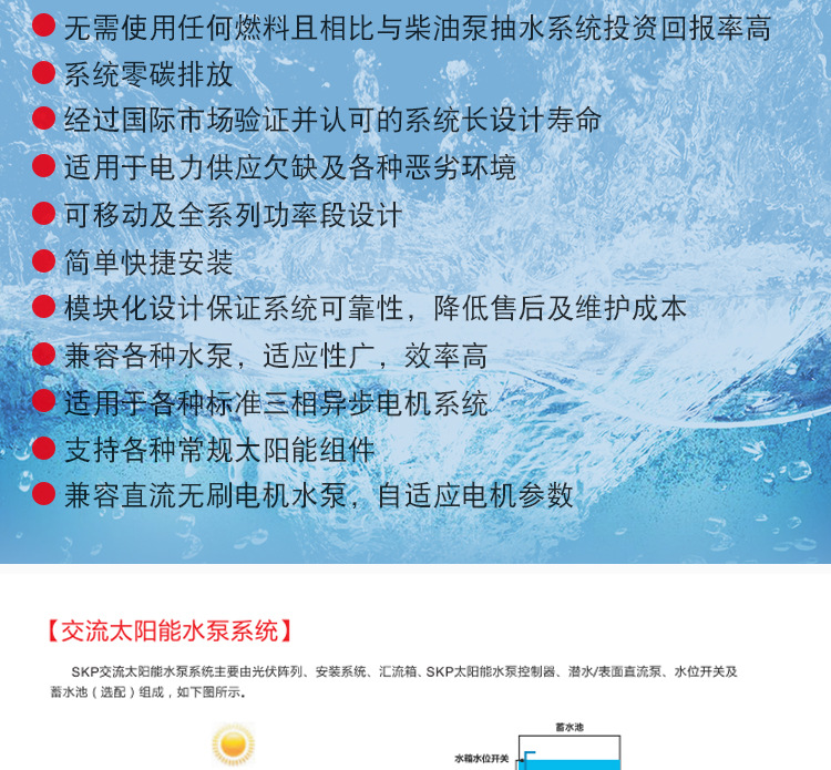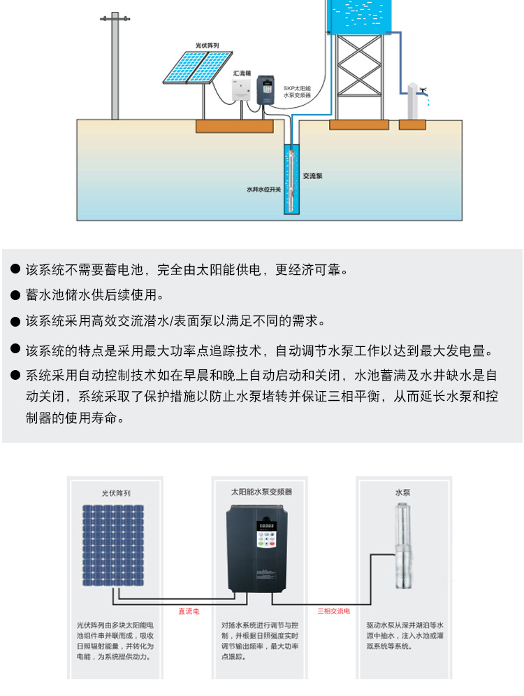 應用行業(yè):廣泛應用于陽光充足、市電短缺的地區(qū),可以解決農(nóng)場灌溉、畜牧養(yǎng)殖、生產(chǎn)生活的用水問題。
