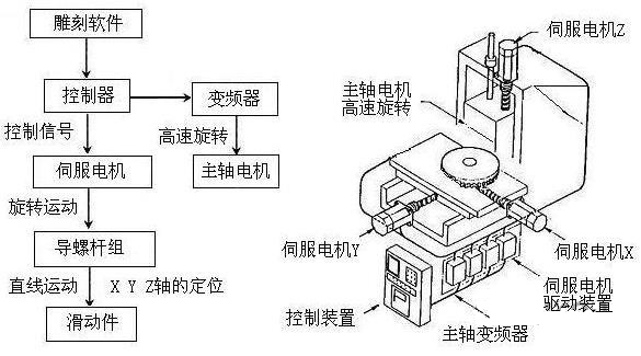 當(dāng)今主流數(shù)控雕刻機(jī)是由計(jì)算機(jī)、雕刻機(jī)控制器、雕刻機(jī)主體三部分組成,其工作原理是通過計(jì)算機(jī)內(nèi)配置的專用雕刻軟件進(jìn)行圖樣設(shè)計(jì)和排版,經(jīng)由計(jì)算機(jī)把設(shè)計(jì)與排版的信息傳送至雕刻機(jī)控制器中,再由控制器把這些信息轉(zhuǎn)化成能驅(qū)動(dòng)步進(jìn)電機(jī)或伺服電機(jī)的脈沖信號(hào),控制雕刻機(jī)主體上X、Y、Z三軸的雕刻走刀定位。同時(shí),控制器啟動(dòng)變頻器,帶動(dòng)主軸電機(jī)的雕刻頭高速旋轉(zhuǎn),對(duì)固定于主機(jī)工作臺(tái)上的加工材料進(jìn)行切削、鉆銑,即可雕刻出在計(jì)算機(jī)中設(shè)計(jì)的各種平面或立體的浮雕圖形及文字,實(shí)現(xiàn)雕刻自動(dòng)化作業(yè),按照不同的加工材質(zhì)和工藝要求,可以搭配不同的專用配置刀具。