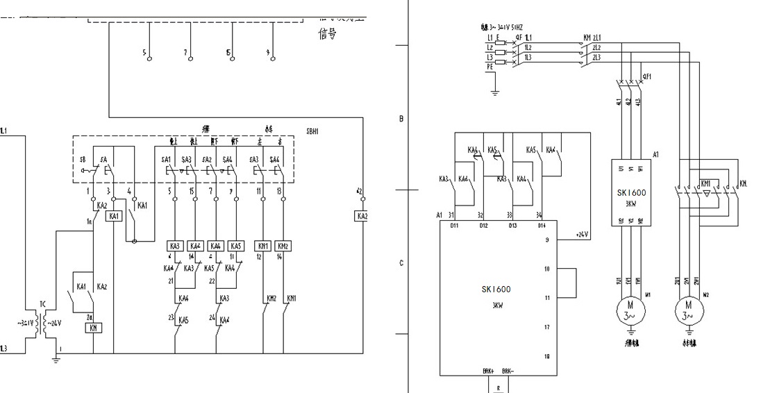 因此我們在本方案中計(jì)劃加兩個延時(shí)觸頭來穩(wěn)定保障抱閘的有效性。vfd的宏選擇交變宏。但考慮到葫蘆本身的抱閘較緊,以及在低速運(yùn)行頻率較低情況下會無法打開抱閘。這個問題我們可以通過調(diào)試SKI600提升頻率就可以快速解決。