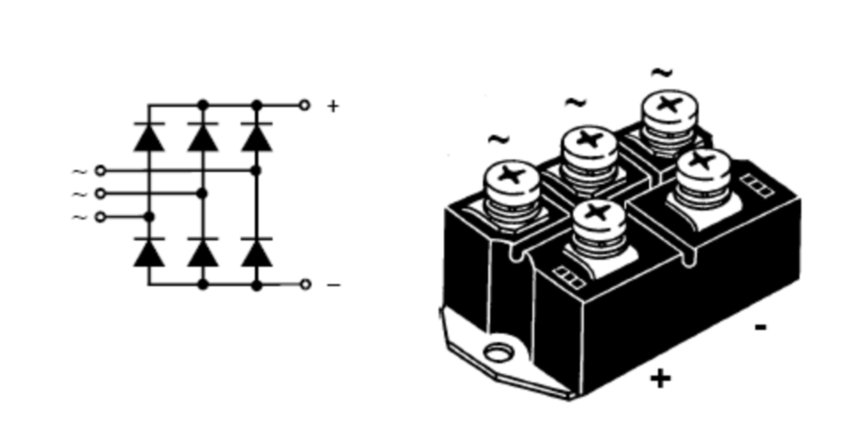 以ED3000 4KW以下的機(jī)器所用的整流橋 MDS25E-16為例: 25是指其額定電流值25A,16指的是其耐壓為1600V。MDS是四菱公司的產(chǎn)品型號(hào),MDS指的是該整流橋是三相全橋整流(六顆二極管),MDC指的是單相整流(2顆二極管封裝)。其實(shí)物示意圖如下:(MDS90/16)