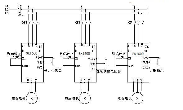該放卷部分一共有三種材料,兩層無(wú)紡布中間夾一層熱熔膠薄膜,均采用杭州三科的SKI600系列的復(fù)合機(jī)變頻器作動(dòng)力放線,利用張力輥反饋回來(lái)的0~10V信號(hào)與給定量信號(hào)作雙向PID運(yùn)算,PID給定由外部電位器實(shí)現(xiàn),其中張力輥的配重由氣壓實(shí)現(xiàn)以適應(yīng)不同材料不同張力的要求。放卷時(shí)要保證放卷輥與熱壓輥之間的材料張力基本一致否則容易出現(xiàn)材料褶皺。同時(shí)利用反饋信號(hào)保證SKI600在無(wú)材料或者材料斷線的情況下
