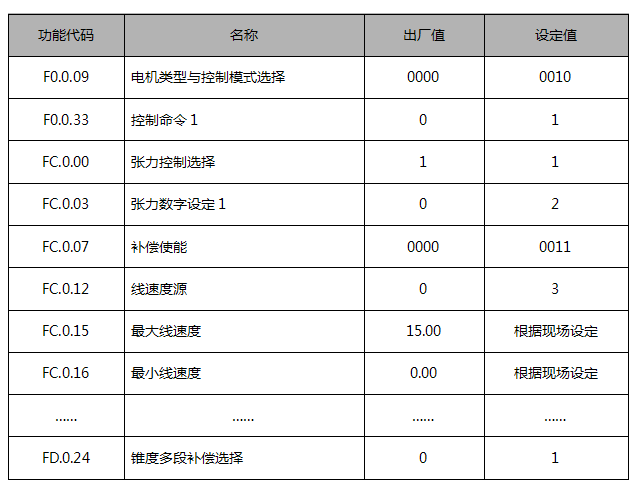 收卷變頻器采用閉環(huán)矢量模式,通過模擬電位器給定張力(收卷模擬輸入端AI1),線速度由牽引AO1模擬輸出端接入收卷AI2(4~20mA)。