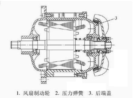 錐形轉(zhuǎn)子電動(dòng)機(jī)定子內(nèi)腔和轉(zhuǎn)子外形都成錐形,其錐形制動(dòng)環(huán)鑲嵌于風(fēng)扇制動(dòng)輪上,靜制動(dòng)環(huán)鑲在后端蓋上,定子通電后,產(chǎn)生旋轉(zhuǎn)磁場(chǎng),同時(shí)產(chǎn)生軸向磁拉力,使轉(zhuǎn)子軸向移動(dòng)并壓縮彈簧,使風(fēng)扇制動(dòng)輪上的錐形環(huán)與靜制動(dòng)環(huán)離開(kāi),轉(zhuǎn)子開(kāi)始轉(zhuǎn)動(dòng),定子斷電后,軸向磁拉力消失,轉(zhuǎn)子在彈簧的作用下,連同風(fēng)扇制動(dòng)輪一起復(fù)位,使動(dòng)靜制動(dòng)環(huán)接觸,產(chǎn)生摩擦力矩,迫使電動(dòng)機(jī)立即停轉(zhuǎn)。